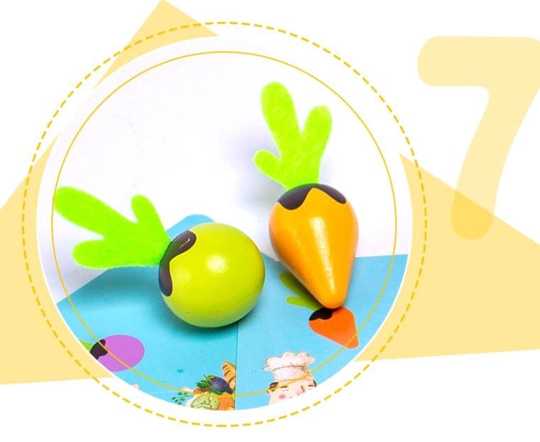 A Horta Educativa Montessori também acompanha 8 cartas, para brincar de colher os alimentos para o cozinheiro. E também pode ser usada como jogo da memória, como mais uma forma de brincadeira.